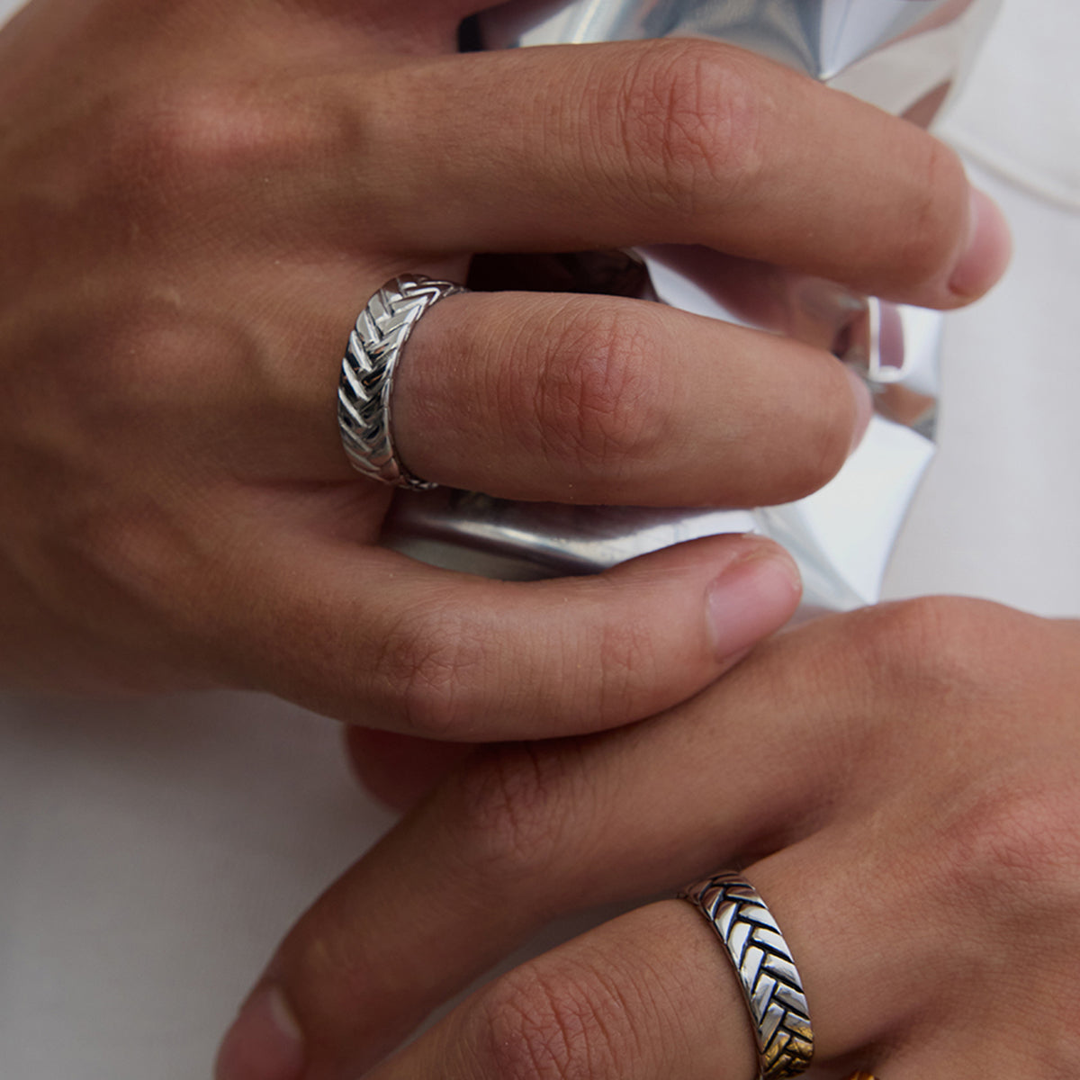 The Chevron Ring features a striking herringbone pattern that adds a dynamic flair to its design. This ring captures light beautifully, enhancing its bold, contemporary look. Ideal for those who appreciate modern elegance, it’s a perfect addition for making a statement while embodying sophistication and style.