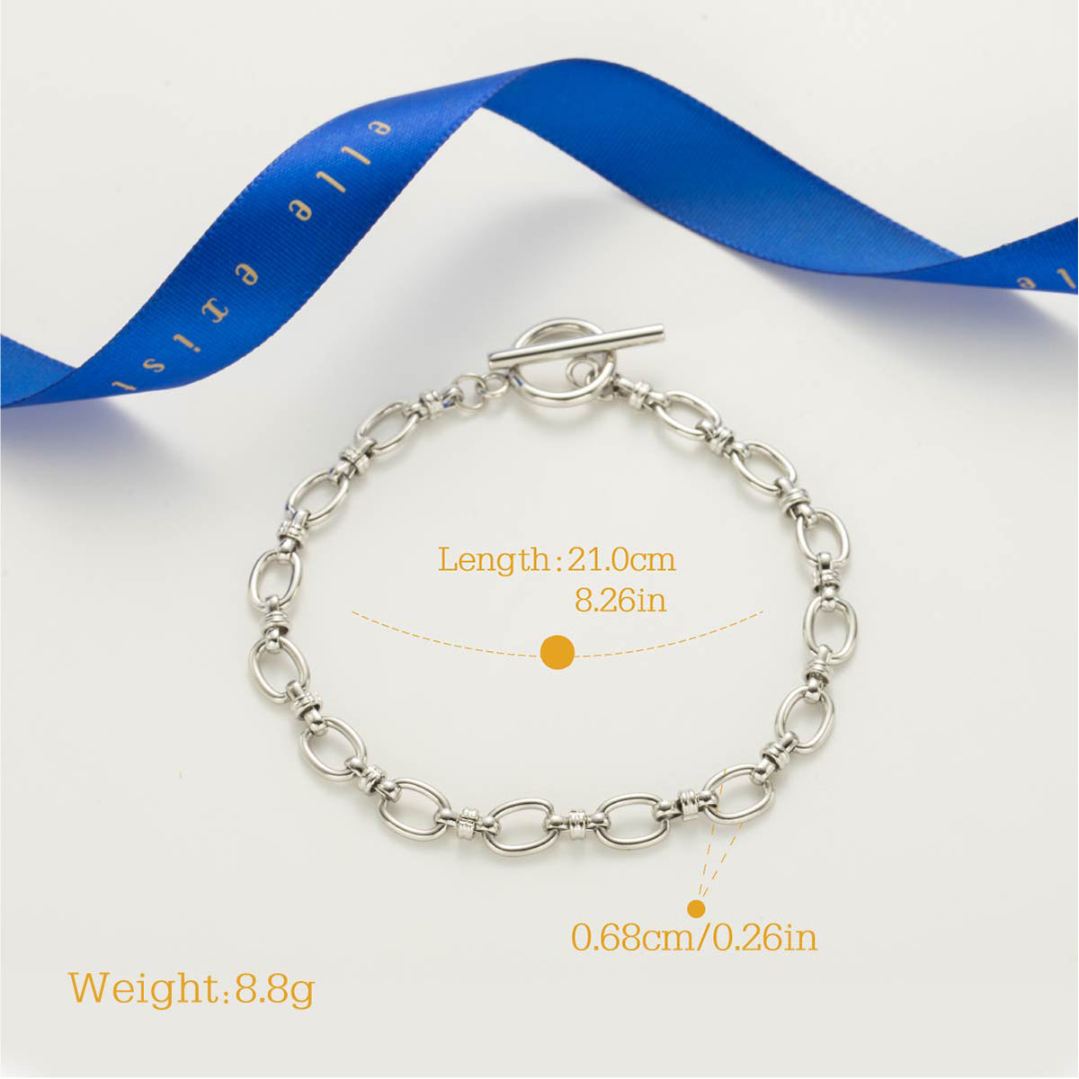The Eternal Links Bracelet is a sophisticated accessory that embodies elegance and timeless style. The toggle clasp adds both functionality and a touch of modern flair, ensuring a secure fit while enhancing the overall aesthetic. Perfect for layering or wearing solo, this bracelet is versatile enough to complement both casual and formal outfits. Embrace the beauty of connection and continuity with the Eternal Links Bracelet, a must-have addition to your jewelry collection.