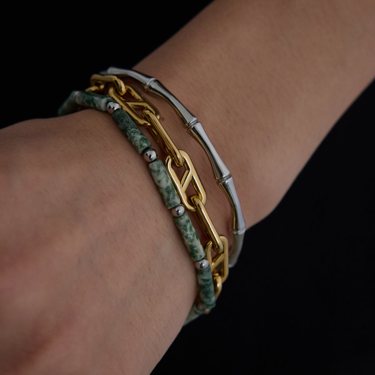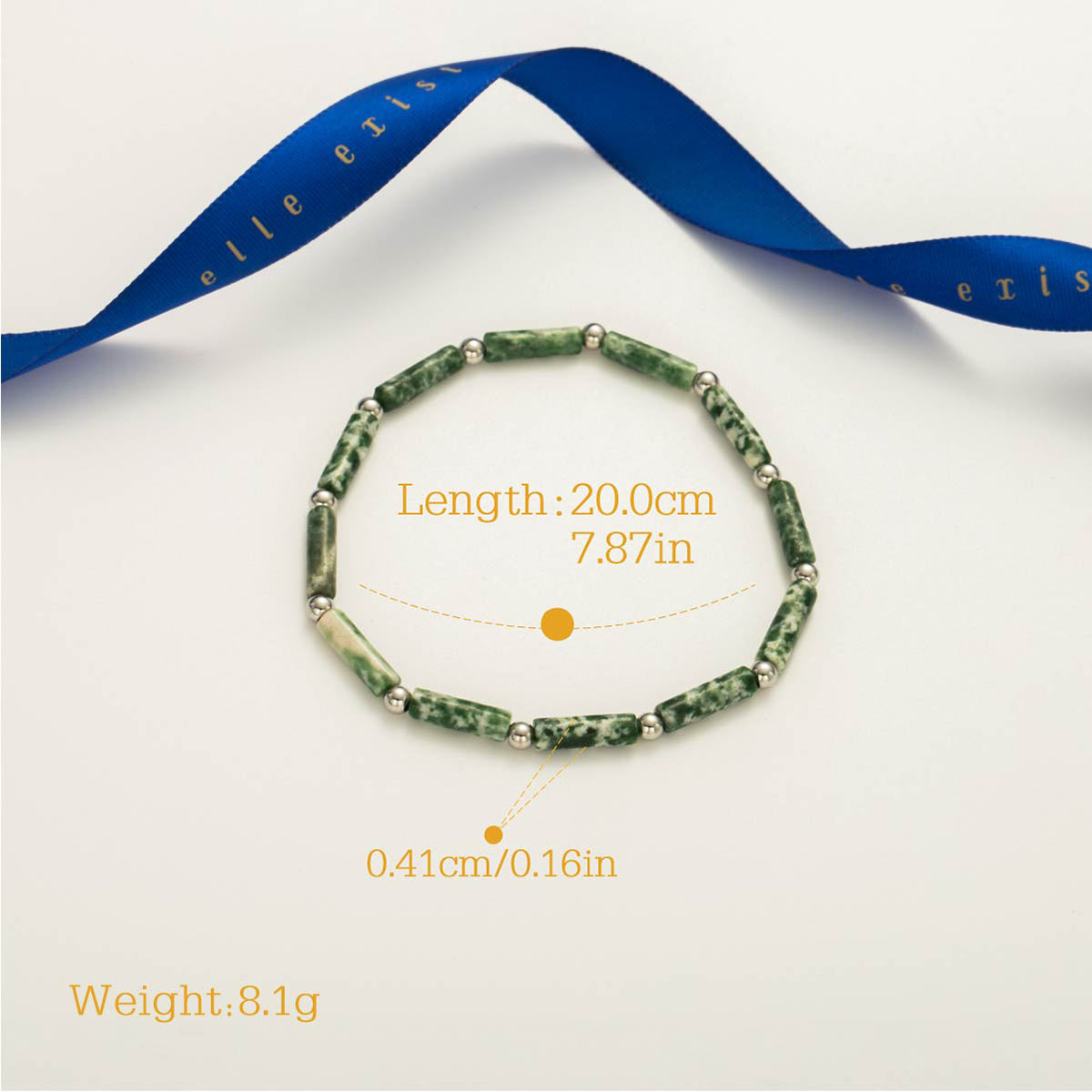 The Jade Serenity bracelet features a captivating arrangement of rectangular jade beads interspersed with metallic accents. The soothing green hues evoke a sense of calm and balance, making it a perfect bracelet for daily wear. Its elastic design ensures comfort and flexibility, allowing it to fit seamlessly into any collection. This bracelet is ideal for those who appreciate natural beauty and elegant simplicity.