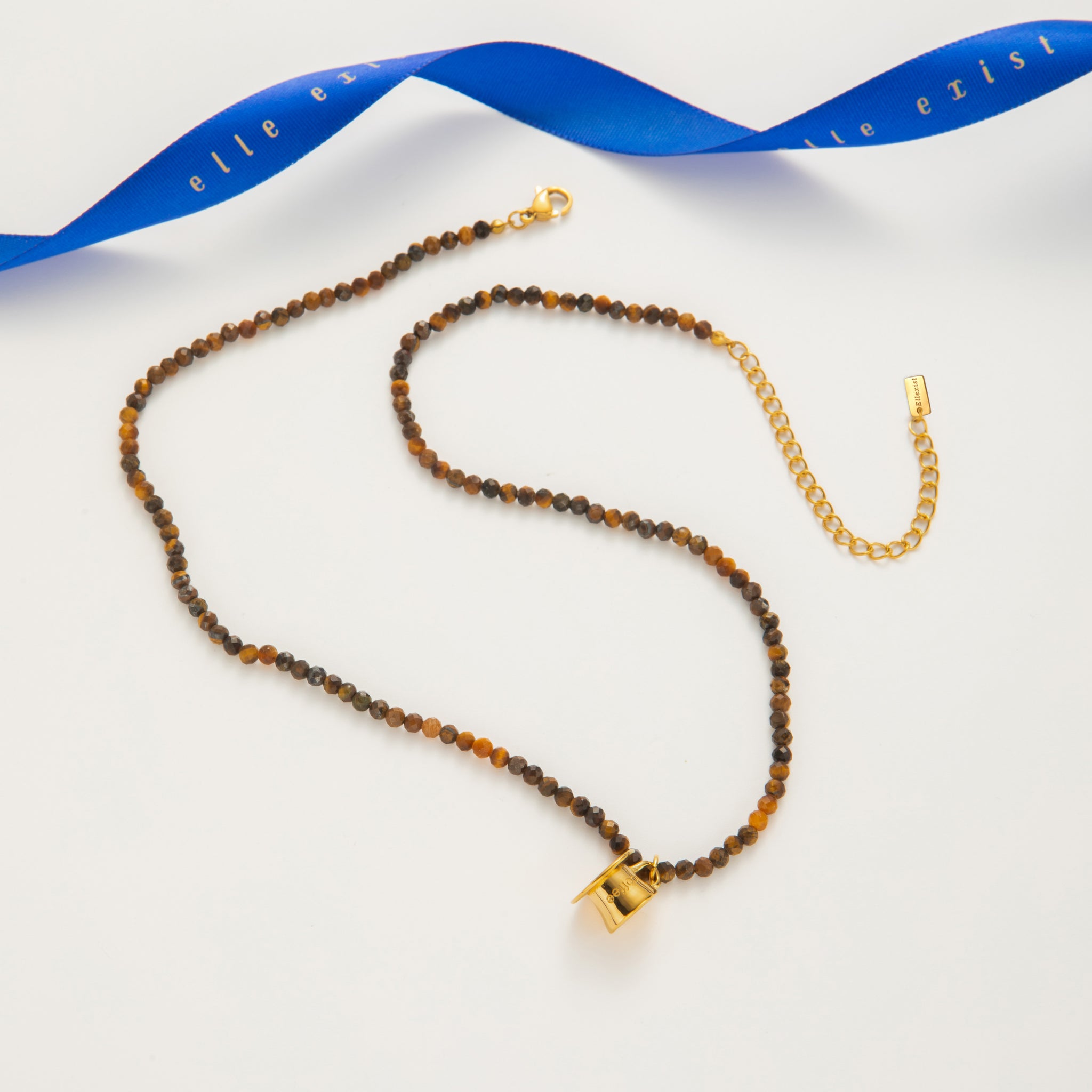This striking necklace showcases a circular pendant with a captivating, sun-kissed hue and an organic, textured surface. It is elegantly suspended from a strand of faceted beads in rich, earthy tones, reminiscent of polished amber and deep mahogany. The adjustable clasp ensures a perfect fit, making this piece a sophisticated accent for both everyday wear and special occasions.