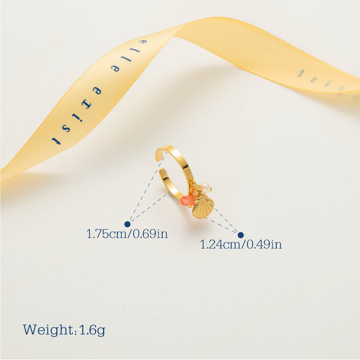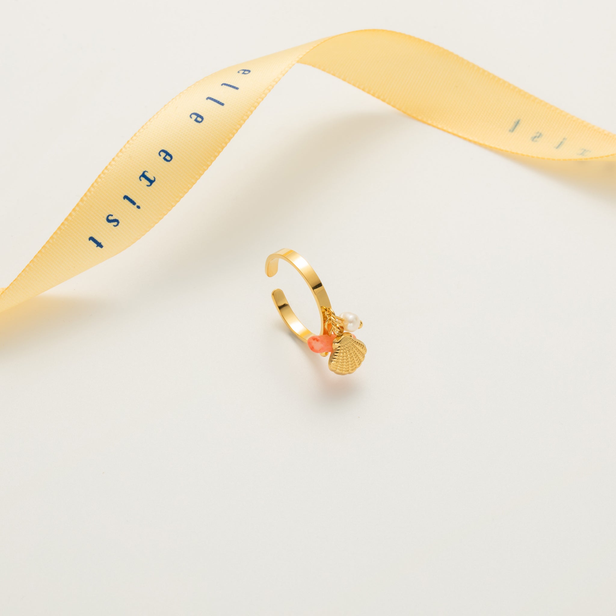 This charming open-band ring is adorned with a delightful cluster of elements, including a blush-toned cylindrical accent, a delicate shell pendant, and a small lustrous bead, all complemented by tiny spherical details. The ensemble evokes a serene, seaside elegance.
