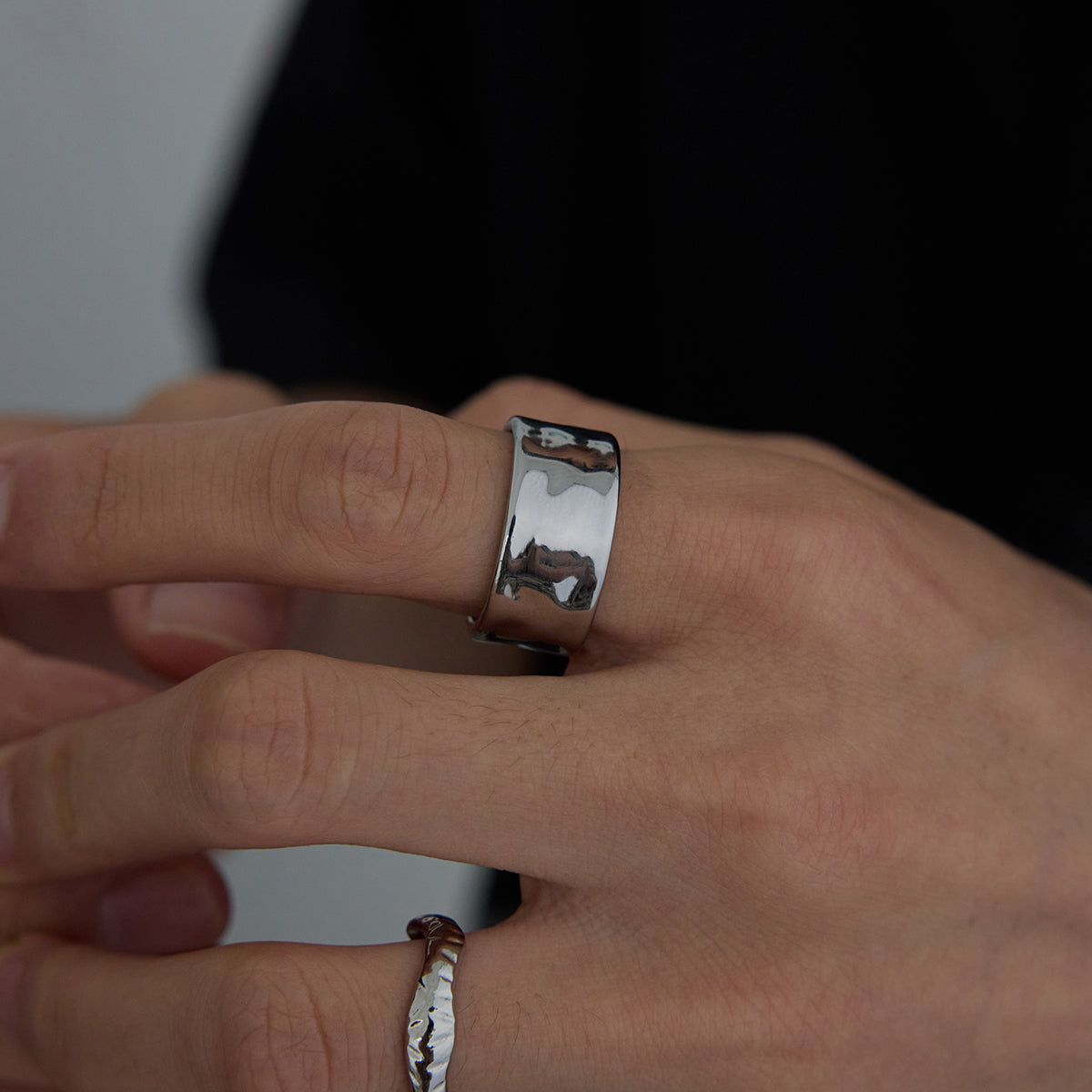 The Bold Elegance Ring features a striking, reflective finish that captures light beautifully, creating a dynamic visual effect. Its substantial width and smooth, contoured design provide a modern yet timeless appeal. This statement piece embodies strength and sophistication, making it an ideal addition for the discerning man who values distinctive style and craftsmanship.