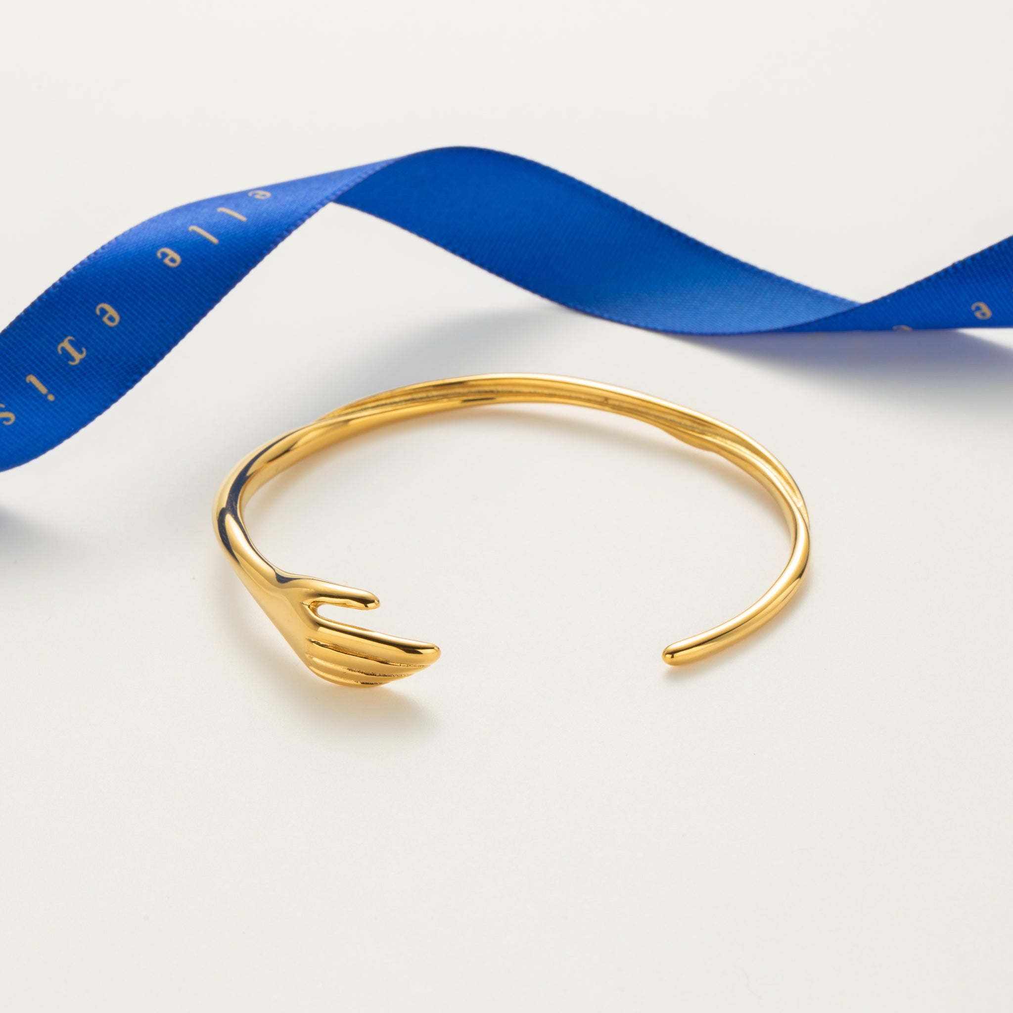 The Guiding Touch bracelet features an elegant open design with a unique hand-shaped detail that symbolizes protection and connection. Its sleek form adds a modern flair, making it a versatile accessory for any outfit. Perfect for layering or showcasing on its own, this piece embodies grace and individuality.