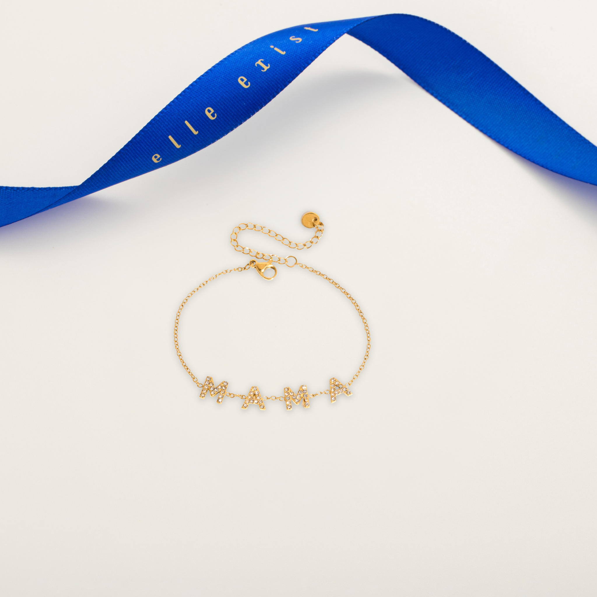 A fine gold bracelet spelling “MAMA” in distinct, radiant letters across a delicate chain.